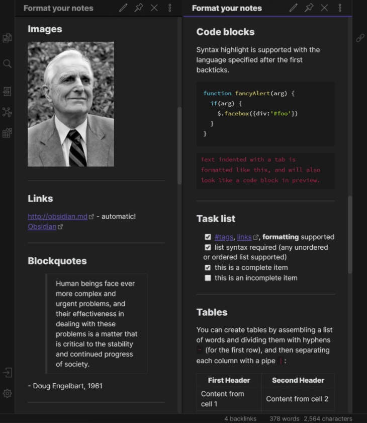옵시디언은 CommonMark와 GitHub Flavored Markdown 과 같은 마크다운 형식을 제공합니다.